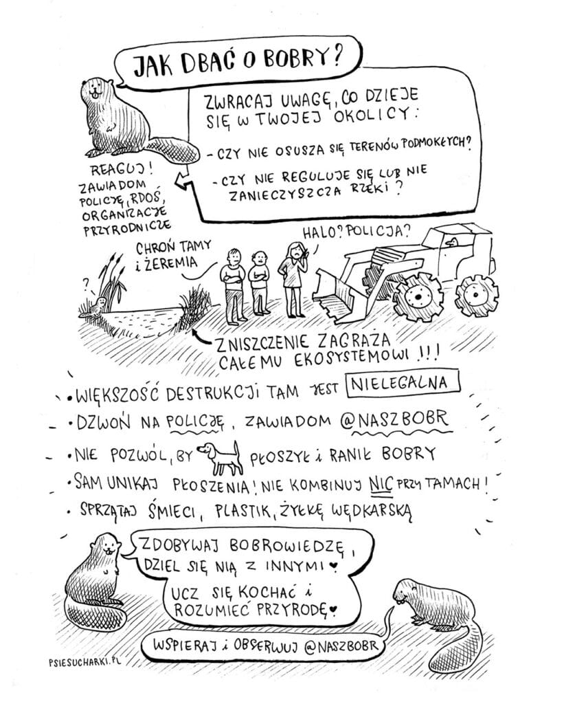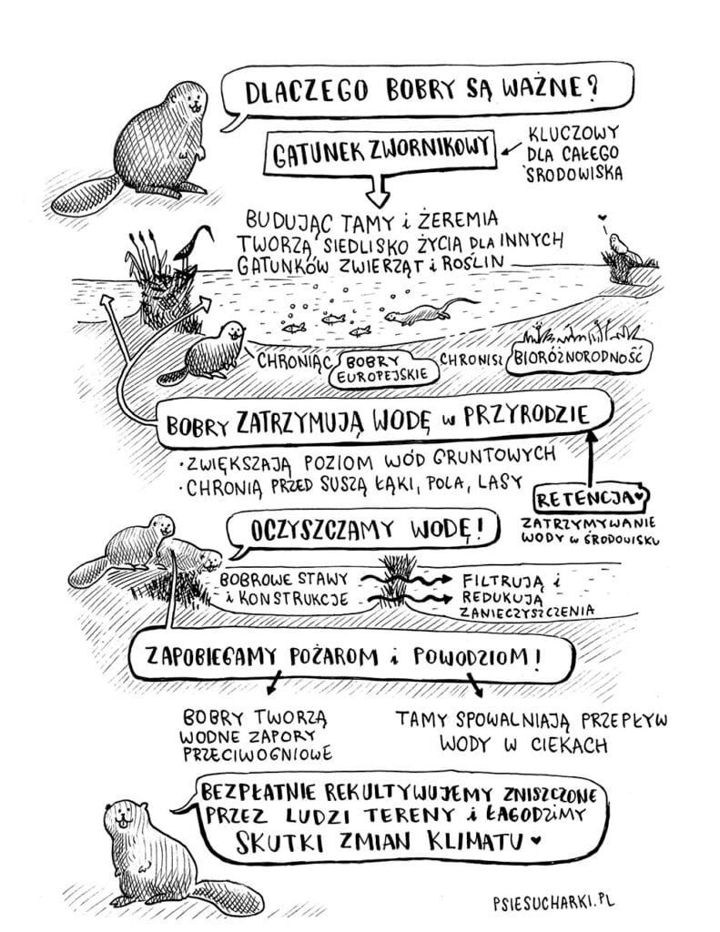 Bóbr to nie szkodnik! Bóbr to RETENCJUSZ – mały mistrz zatrzymywania wody w przyrodzie. Wody u nas, wbrew pozorom, ciągle mało. Już od lat trwa w Polsce SUSZA GEOLOGICZNA, czyli stan długotrwałego niedoboru wód podziemnych, skutkujący niedoborem wód powierzchniowych i warstw wodonośnych. Jeziora, rzeki, stawy wysychają, schną także lasy, łąki i pola uprawne. Ci średniej wielkości, pokryci lśniącym futrem budowniczowie umieją lokalnie rozwiązywać stany niedoboru wody. Nie możemy pozwolić sobie na utratę bobrów! Trzeba chronić bobry i pozwalać im, by chroniły nas!