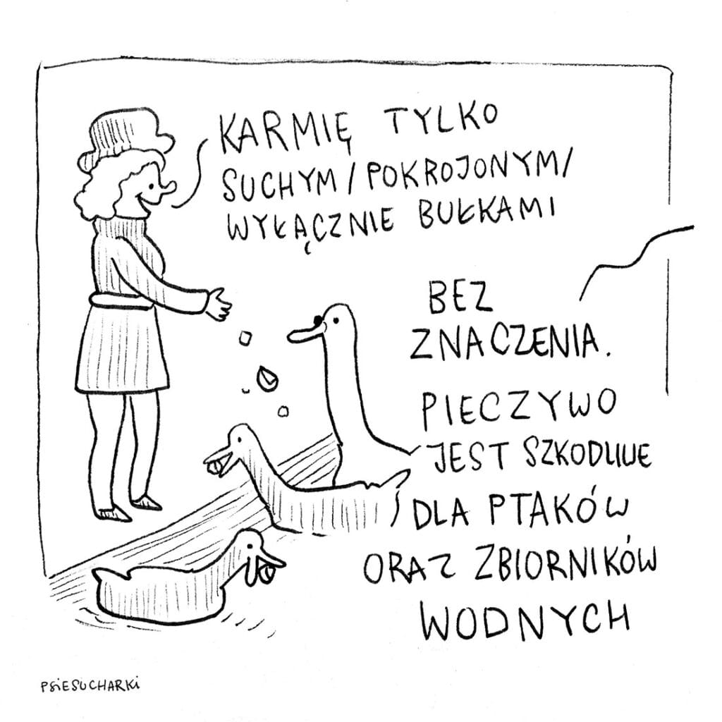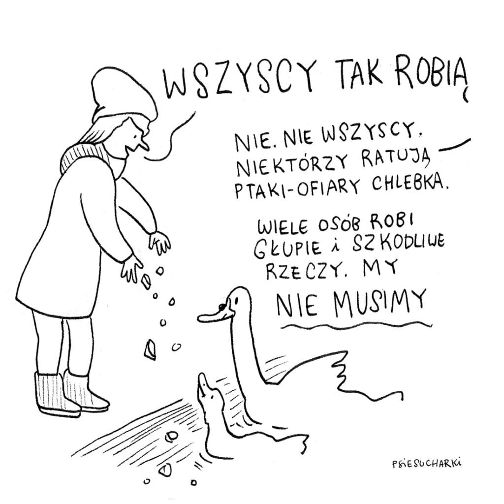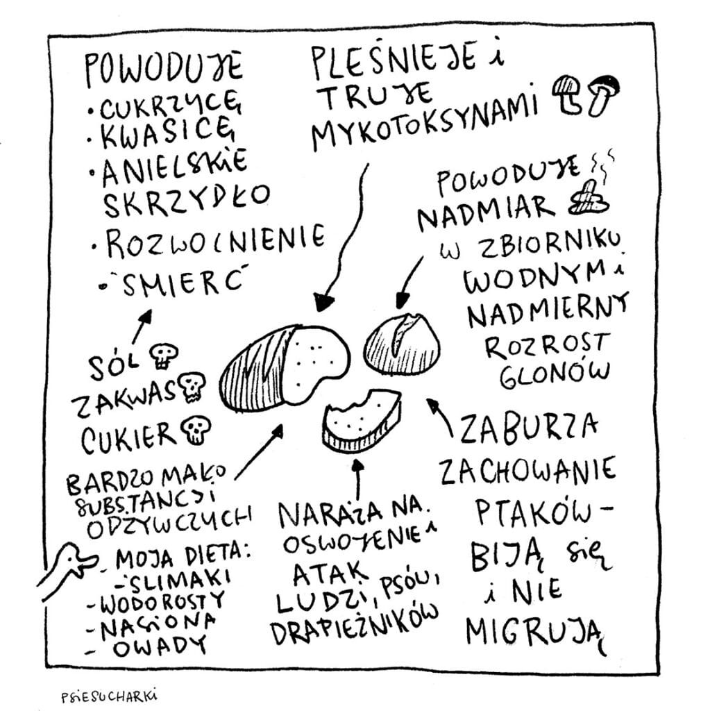 Kaczki, łabędzie, łyski kochają chlebek. Od chlebka cierpią i żegnają się z życiem. Żaden powód nie jest dobry, by szkodzić ptakom wodnym. Nie karm ptaków pieczywem. Reaguj, gdy robią to inni. Sprzątaj pieczywo z brzegu.