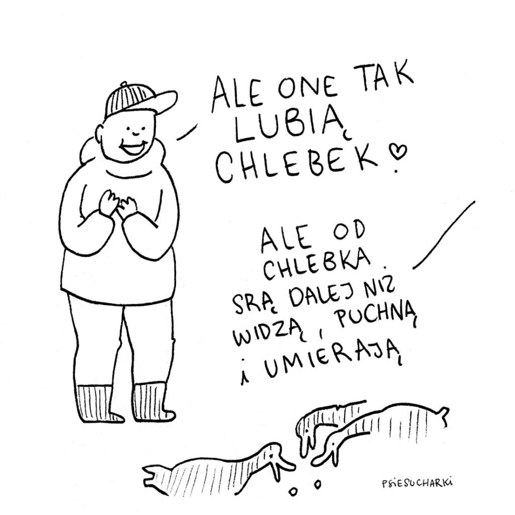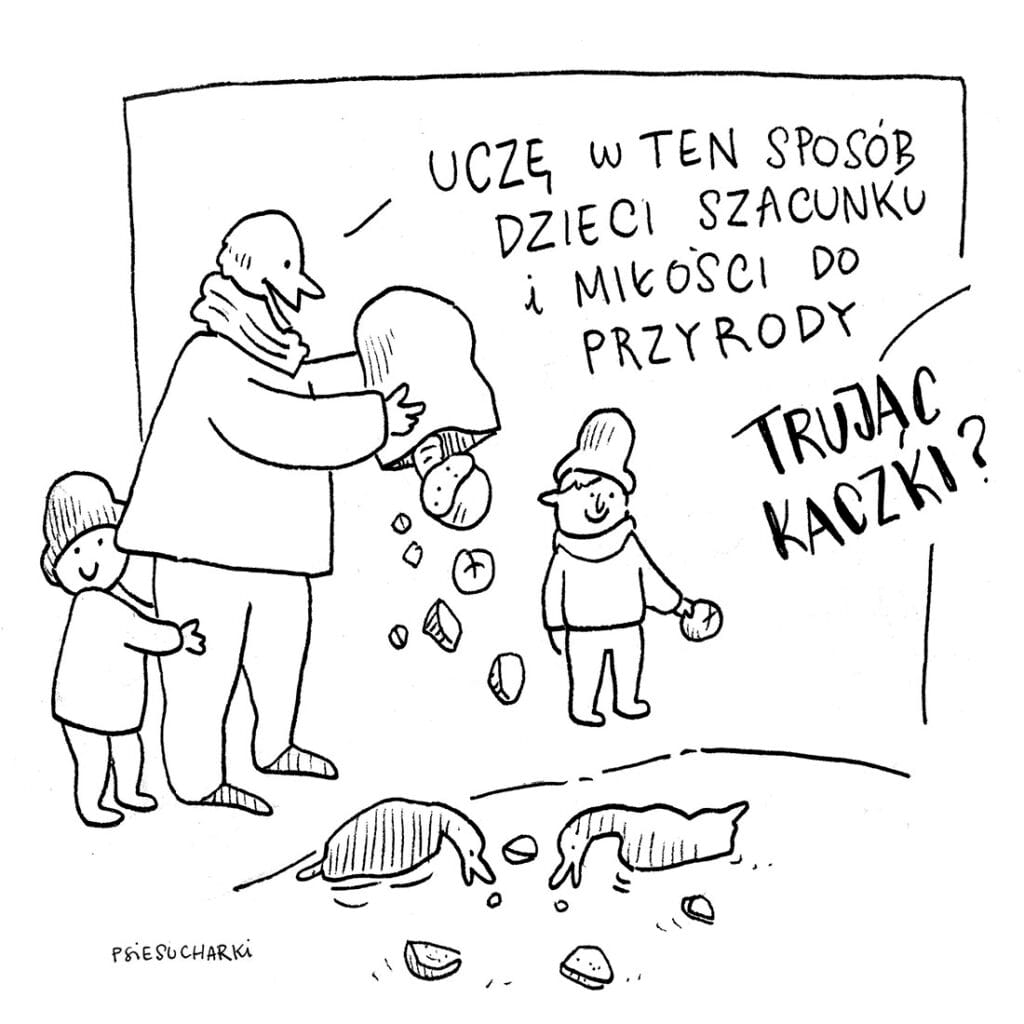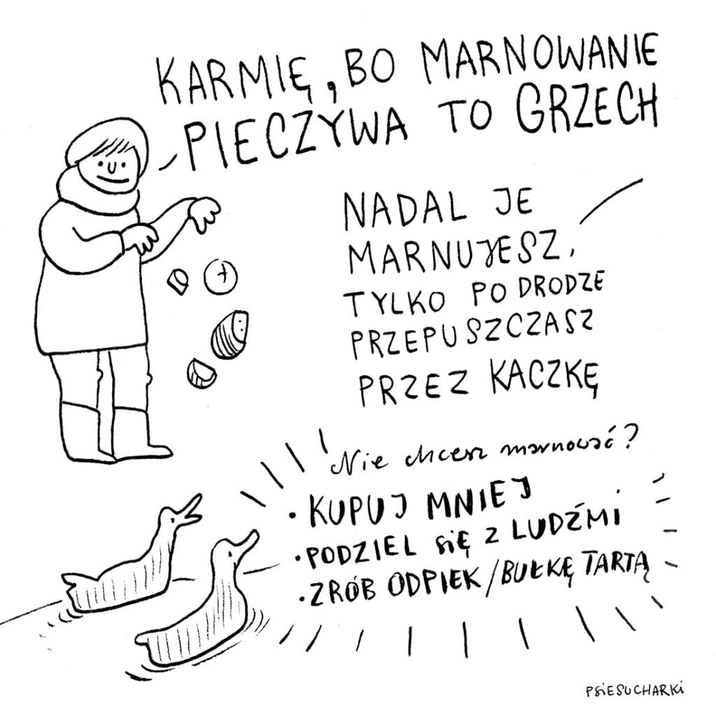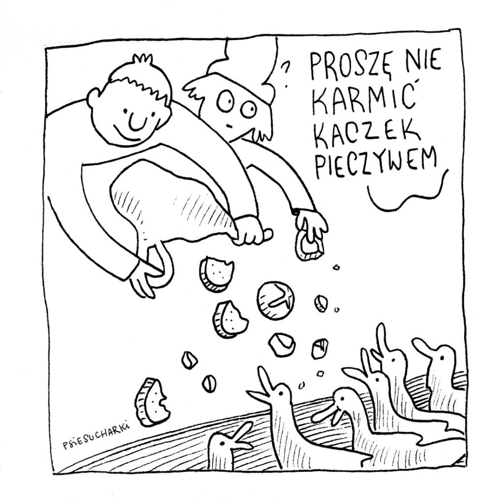 Kaczki, łabędzie, łyski kochają chlebek. Od chlebka cierpią i żegnają się z życiem. Żaden powód nie jest dobry, by szkodzić ptakom wodnym. Nie karm ptaków pieczywem. Reaguj, gdy robią to inni. Sprzątaj pieczywo z brzegu.