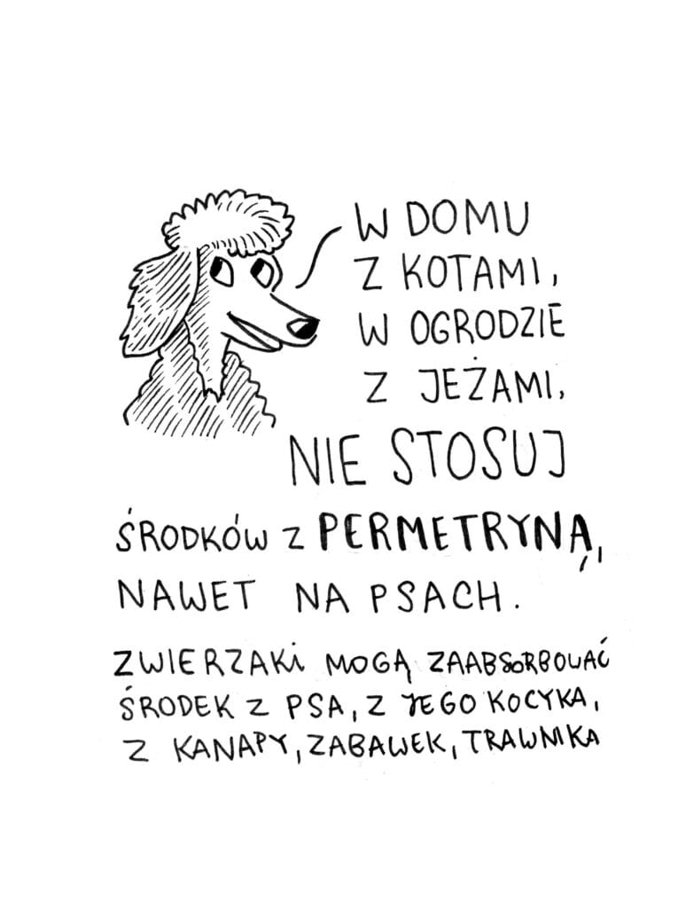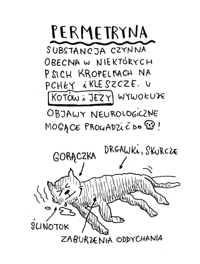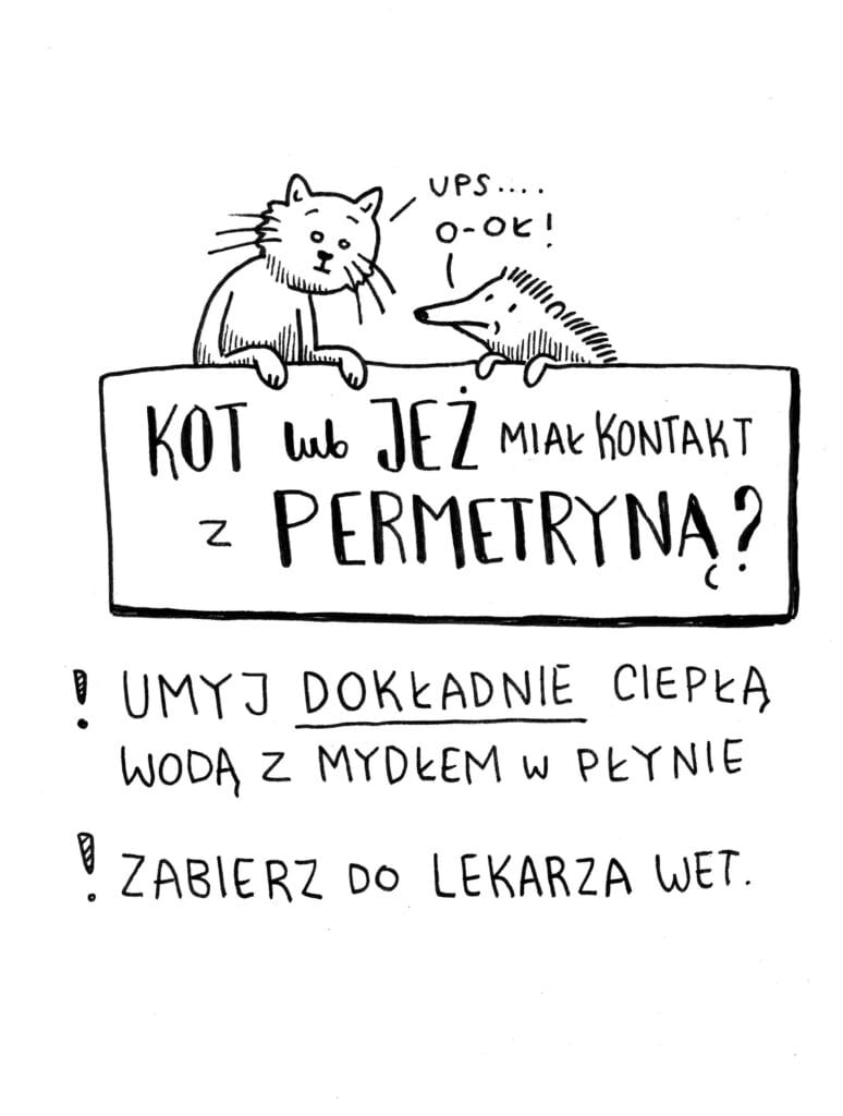 Permetryna jest toksyczna dla kotów i jeży. Przeczytaj o skutkach nieprawidłowego stosowania tego środka. Niestety, zdarza się, że środki z permetryną polecają sprzedawcy, nieświadomi, że dla kota i jeża to trucizna. Czytaj napisy na opakowaniu! Stosuj wyłącznie środki odpowiednie dla danego gatunku.